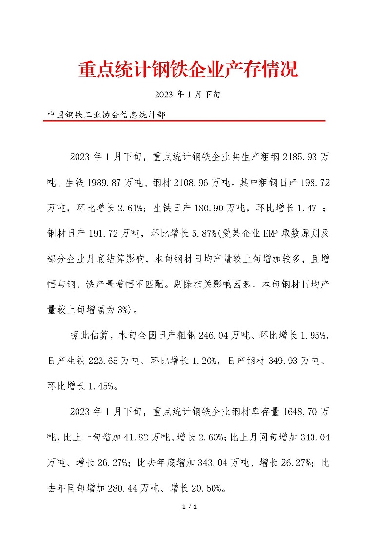 2023年1月下旬重点统计钢铁企业产存情形